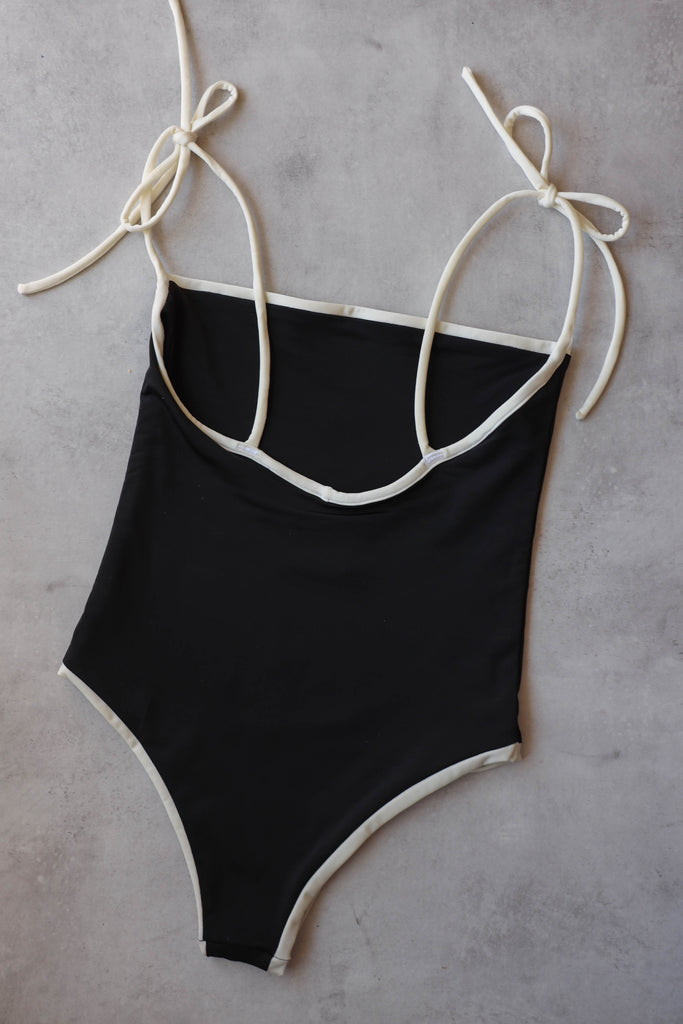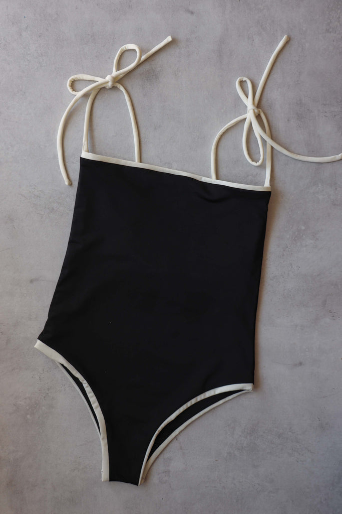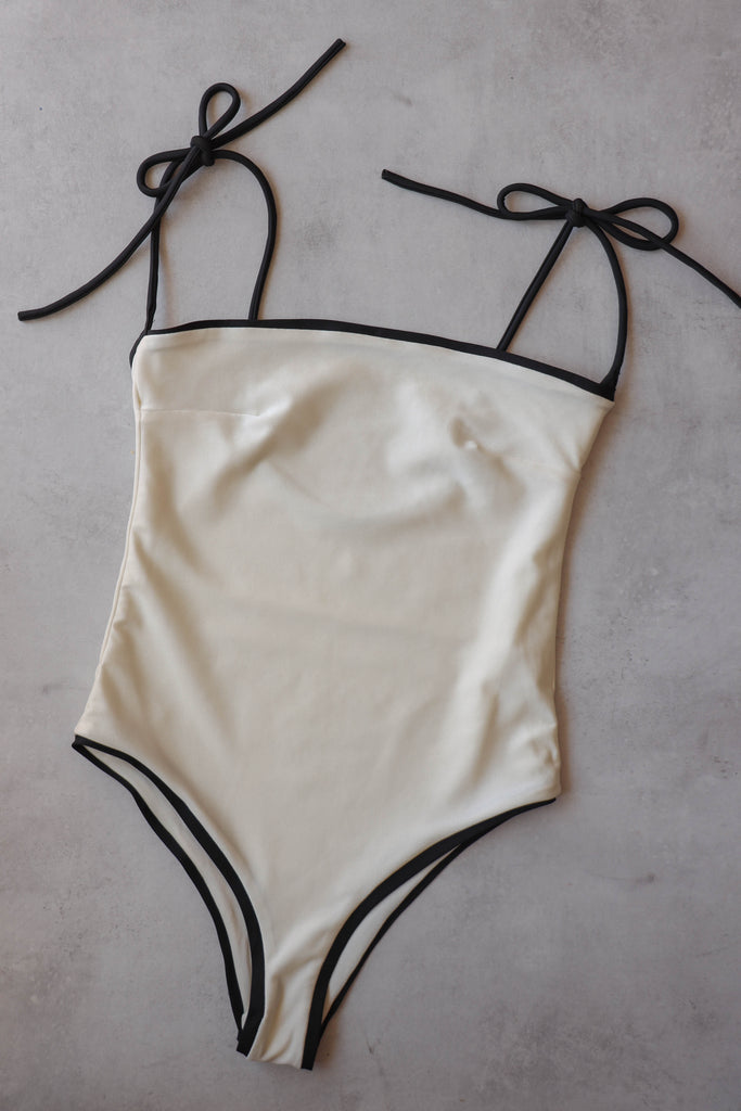 Digital sewing pattern for the Lupe Swimsuit! Designed with a cami bow tie straps and contrast trim in a classic flattering shape. Made from 4-way stretch spandex fabric.