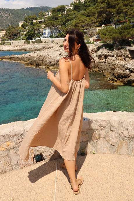 Digital sewing pattern for the Mia Dress. Featuring cami straps, an oversized fit, and ruching detail. Made from double gauze fabric.