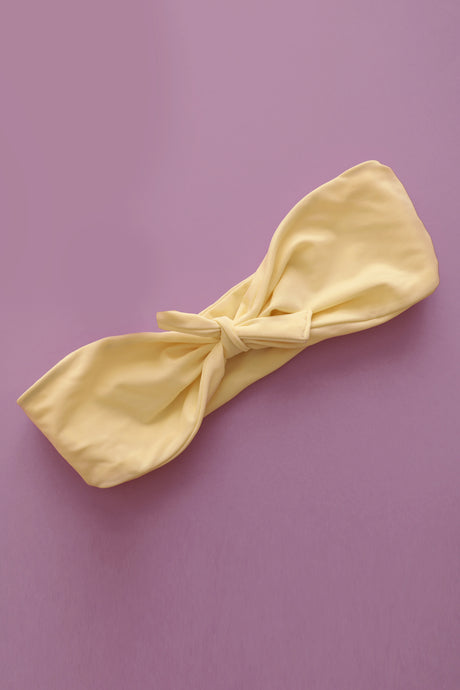 Digital sewing pattern for the Claire Bikini – designed with a front bow and a strapless bandana-style top, made for ivory spandex swim fabric.