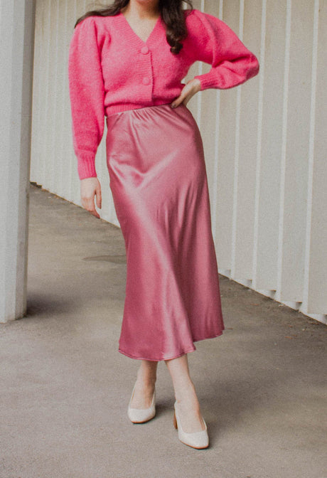 Digitales Schnittmuster für den Chloe-Rock! Mit hoher Taille, schrägem Schnitt und elastischem Bund. Hergestellt aus Satinstoff.
